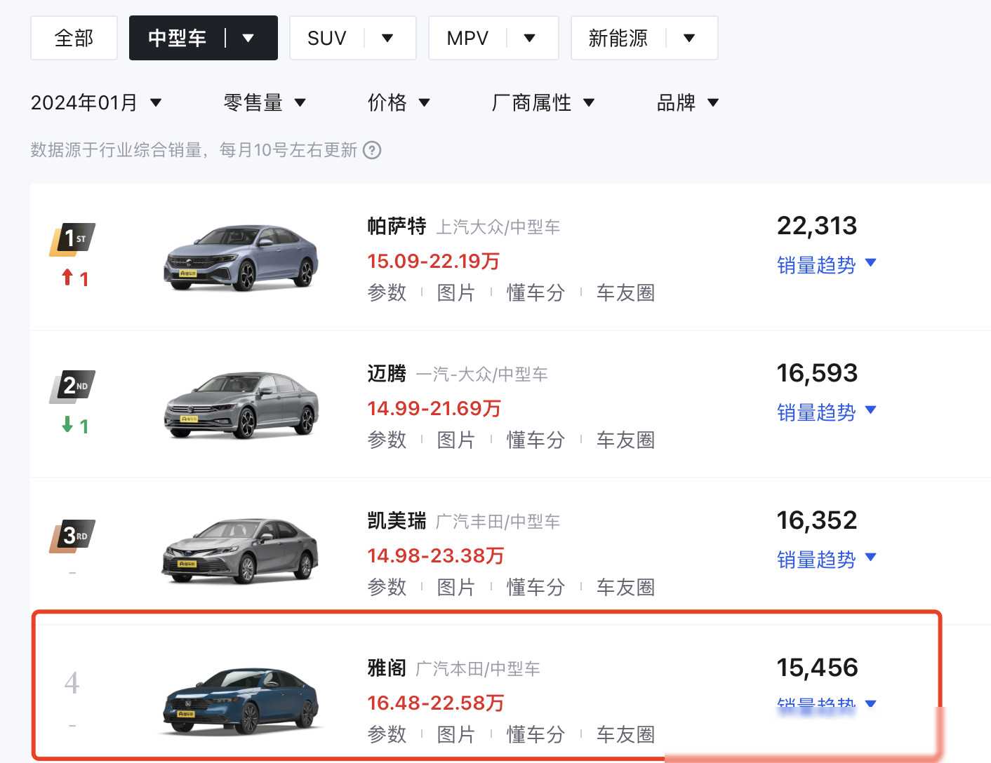 近期,車市上掀起了一股不小的波瀾,而這場風波的中心,正是備受矚目的新款雅閣。這款車自2024年1月面市以來,便以其驚人的銷量成績,在中型車市場占據(jù)了一席之地。據(jù)統(tǒng)計,新款雅閣在短短時間內便創(chuàng)下了15456臺的銷量佳績,勇奪中型車銷量榜單的第四名。而去年12月,它更是以超2.2萬臺的銷量,證明了其市場認可度的堅實基礎。