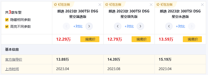 8月4日,玩車弟從上汽大眾品牌官方處獲悉,旗下朗逸車型新增了一款名為300TSI星空領先版的配置版本,售價為14.39萬元。參考現款車型配置來看,新版本車型定位于售價13.89萬的星空滿逸版和售價15.19萬的星空永逸版之間,屬于次頂配車型。