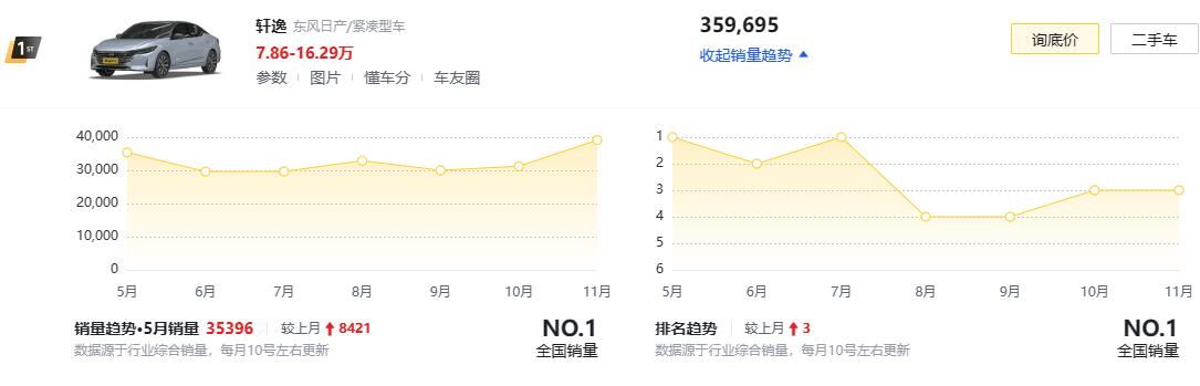 據最新行業綜合銷量數據顯示,軒逸近一年的銷量高達359695輛,比第二名的大眾朗逸多了1萬多輛,比第三名的比亞迪秦PLUS DM-i多了6萬多輛。足以可見軒逸是非常受市場的青睞,同時也備受廣大消費者的支持和喜愛。