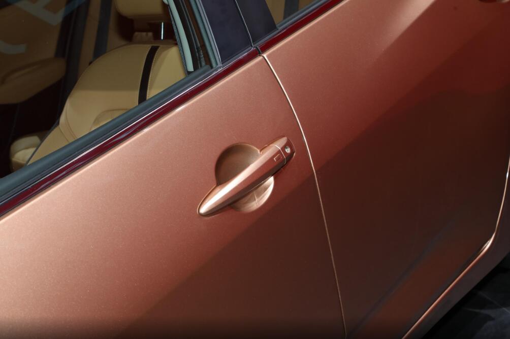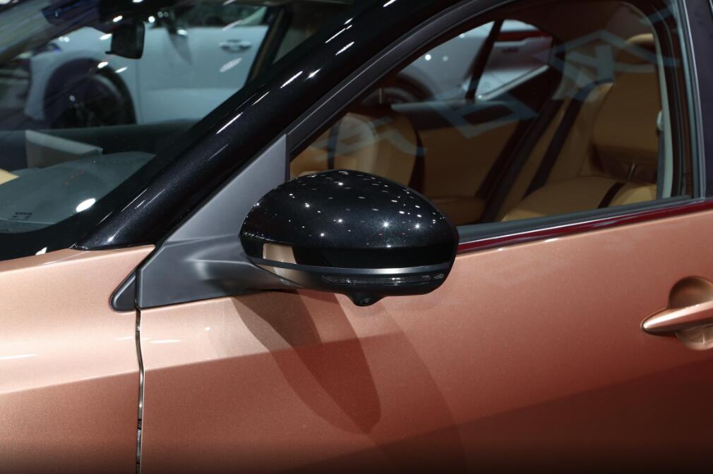 值得一提的就是,車窗框周圍黑色的密封條和A、B柱的曜石黑色色漆交相輝映,再結合搶眼的后視鏡,這在視覺上形成了強烈對比,增強了車輛的色彩層次感。車門把手與車身顏色相同,與整車的色調融為一體,顯示出了車輛設計的細致考慮。
