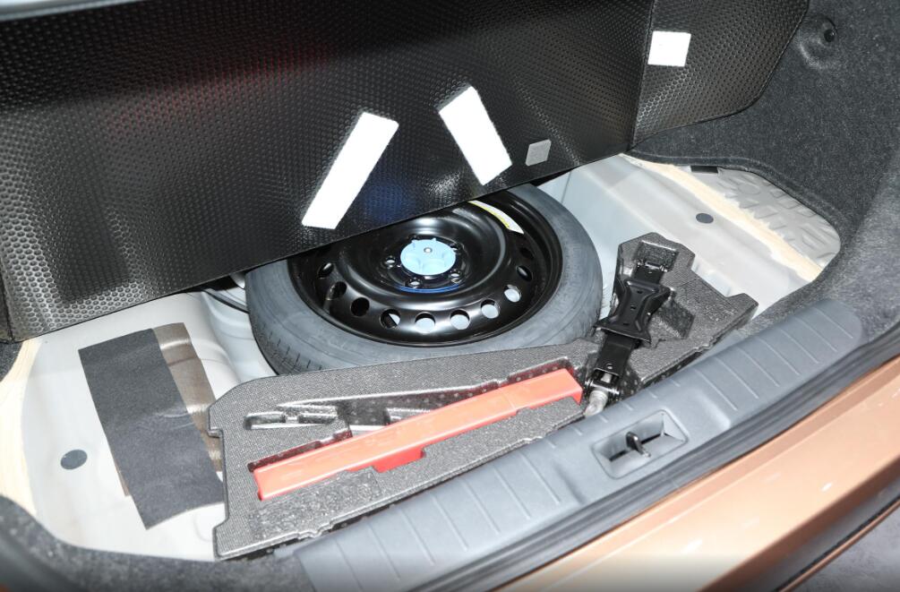 揭開內襯墊便是軒逸后備箱內部的備胎和工具組。非全尺寸的備胎位于后備箱的底部,看起來是一個全尺寸的輪胎而不是臨時使用的小型備胎。而這樣的設計裝配,充分考慮到了在發生輪胎故障時用戶的長途駕駛需求。