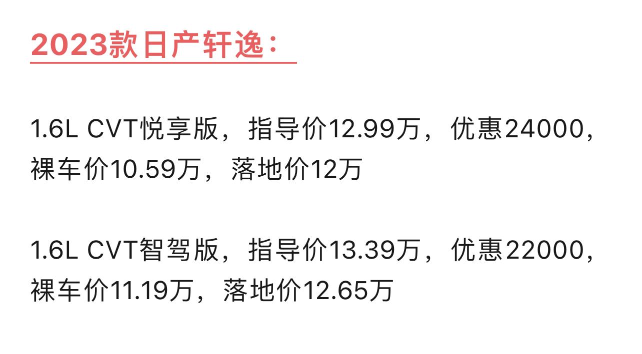 23款新軒逸,目前最走量的版本是1.6升悅享版,廠商指導(dǎo)價(jià)12.99萬,現(xiàn)在終端能優(yōu)惠2.4萬,總共12萬左右就可以落地。1.6升智駕版優(yōu)惠少2000元,總共12.65萬左右可以落地。至于軒逸的混動,完全沒有購買的必要。一是價(jià)格比雙擎卡羅拉、雷凌貴很多,二是油耗控制的還沒有它兩個好,市場認(rèn)可度也遠(yuǎn)不如豐田、本田的混動。買軒逸就圖個穩(wěn)定、可靠、省油,混動版的軒逸可謂三不沾。