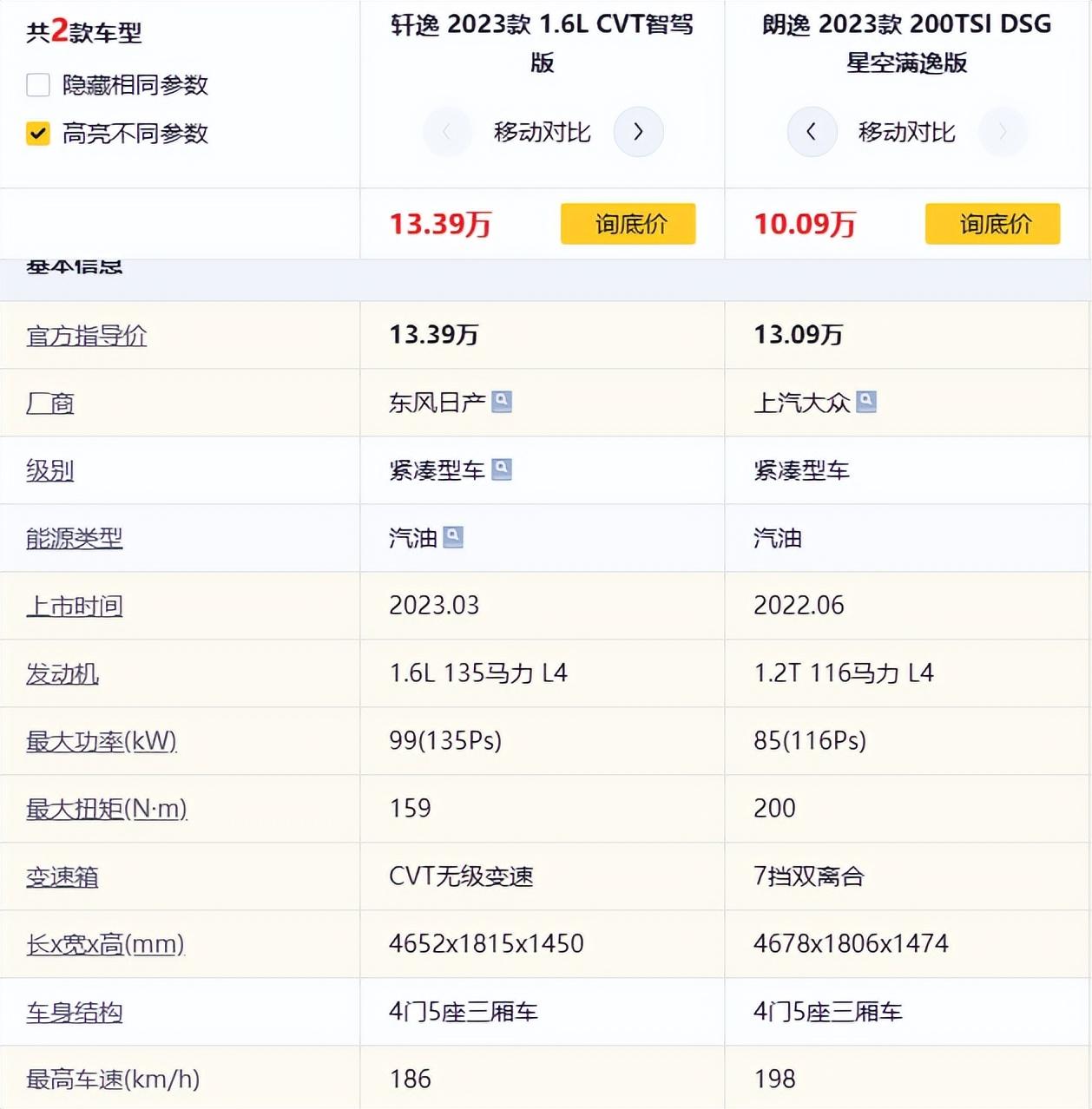 動力方面,13.39萬的軒逸2023款1.6L CVT智駕版搭載1.6L發動機,匹配CVT無級變速箱,最大功率99KW,最大扭矩159N·m。13.09萬元的大眾朗逸2023款200TSI DSG則是搭載大眾1.2T發動機,最大功率85KW,最大扭矩200N·m。對比之下,同樣13萬元左右,朗逸的性能明顯更強一些。至于油耗,官方數據顯示軒逸百公里5.57L,朗逸百公里5.6L,基本差不多。
