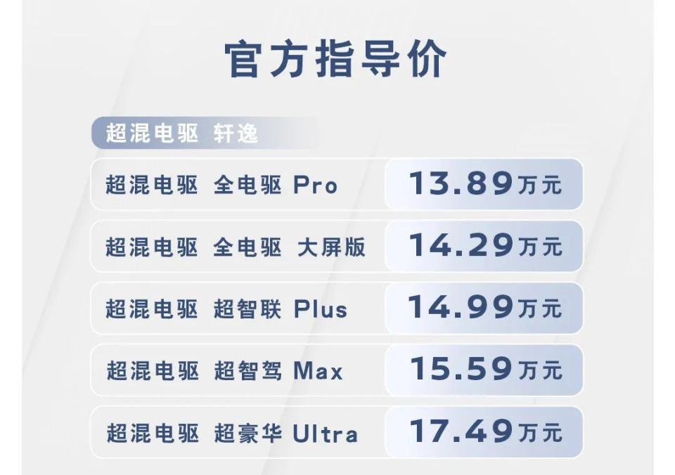 東風日產(chǎn)軒逸 2023款超混電驅提供了五種不同配置車型,價格區(qū)間為13.89萬-17.49萬。