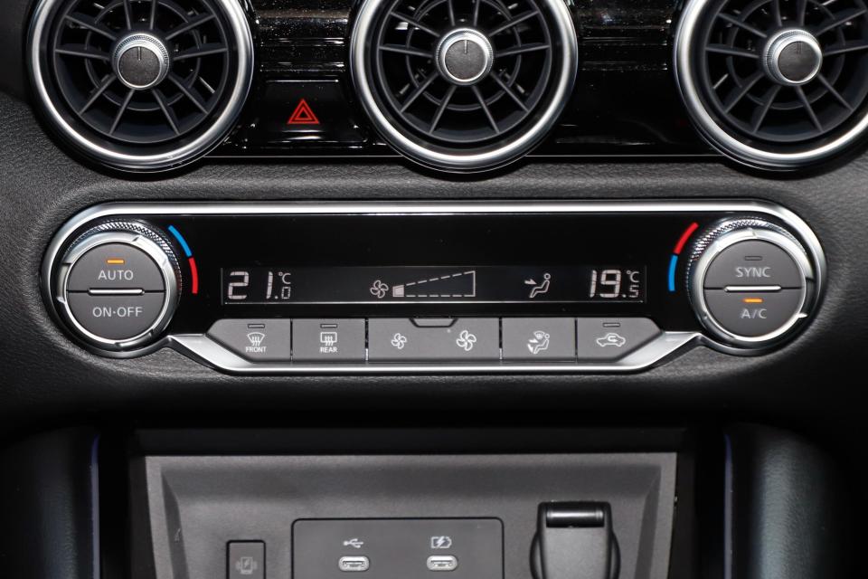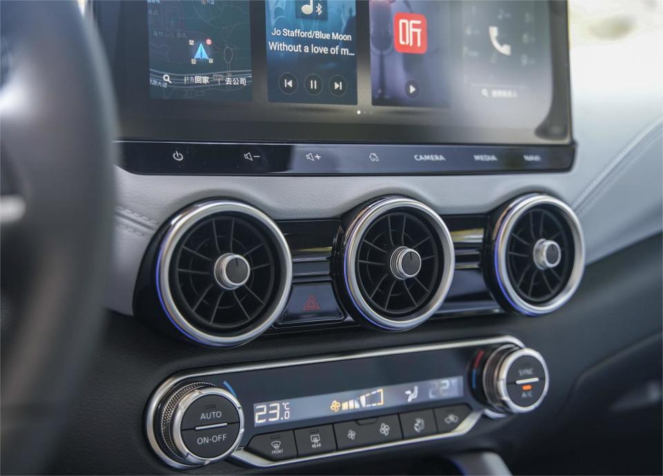 超混電驅軒逸的下方空調出風口采用了三個圓筒風格的設計,邊緣采用銀色鍍鉻涂裝,增添了一些裝飾性。而正中央?yún)^(qū)域的小圓點是用于調節(jié)扇葉大小,用于控制風量。空調功能控制區(qū)并沒有納入中控屏內,而是采用了傳統(tǒng)的旋鈕和按鍵設計,這一點值得贊賞。中央通道采用烤漆面板設計,觸摸時不容易留下指紋,這對保持車內整潔和清潔是有益的。