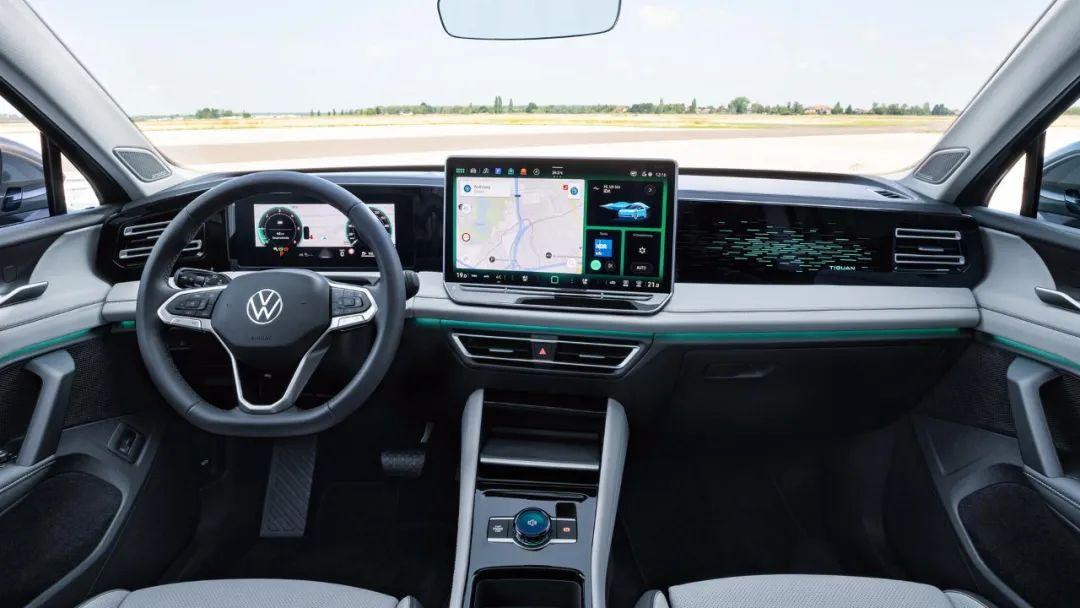 內飾方面,全新途觀看起來更有電動車的味道。細節設計上,新車的中控臺采用不對稱式設計,中間的屏幕提供12.9英寸和15英寸可選,并采用OLED面板。同時,新車采用10.25英寸全液晶儀表以及懷擋設計,中央島臺的儲物空間更加豐富。