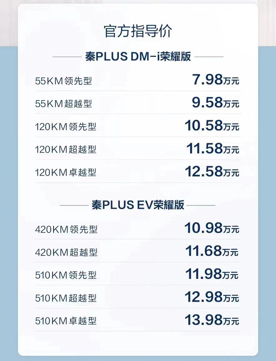 據比亞迪官方發(fā)布的消息,最新上市的秦DM-i榮耀版官方指導價為7.98萬元—12.58萬元,EV榮耀版官方指導價為10.98萬元—13.98萬元。
