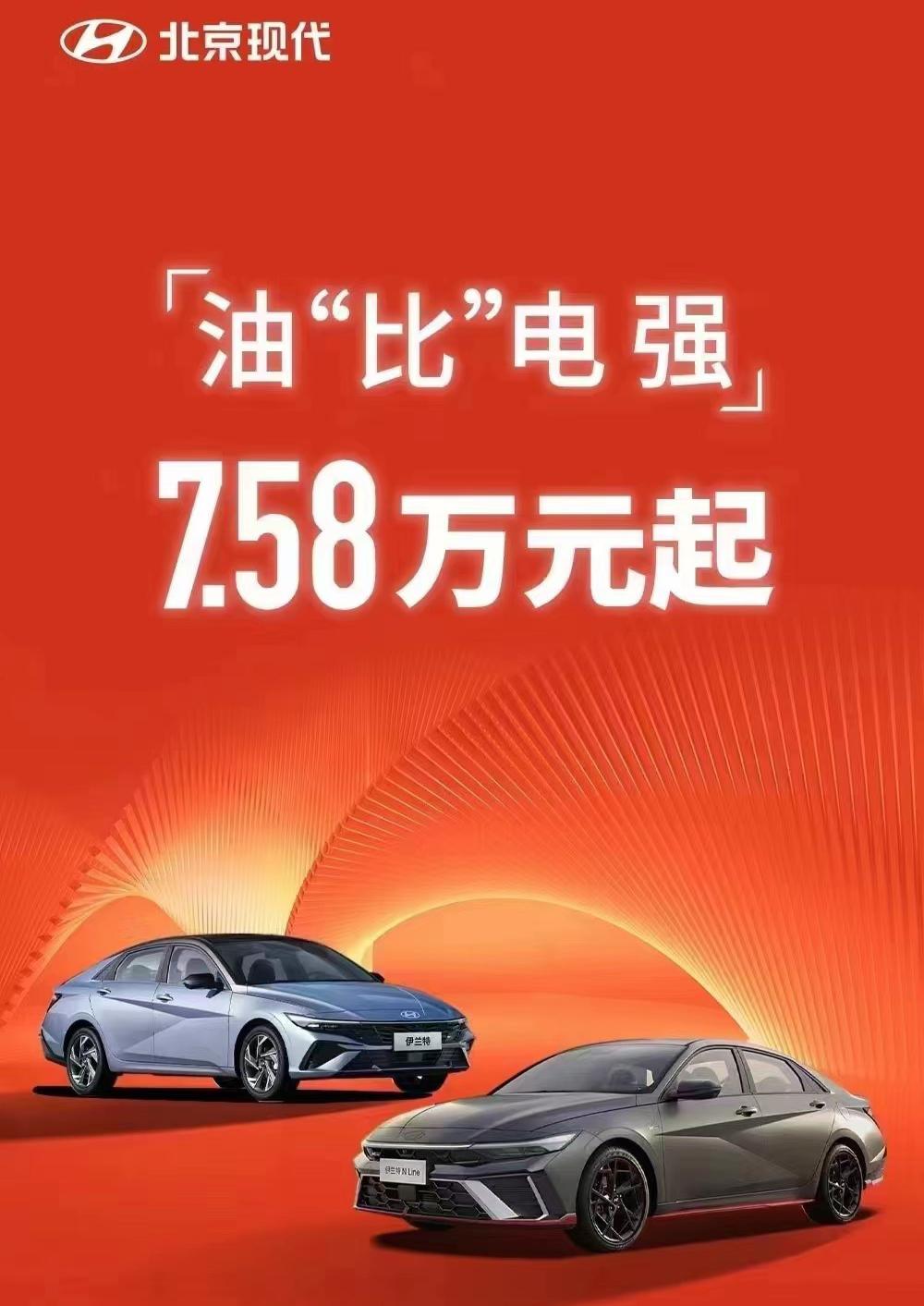燃油車也不甘落后,北京現代表示跟進。海報顯示,北京現代伊蘭特價格降到7.58萬元起。在海報中,現代還表示油“比”電強。