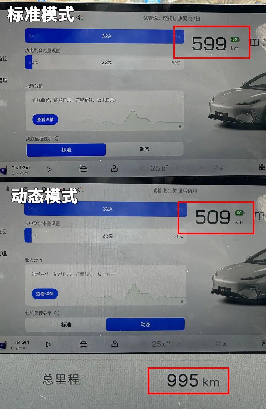這款車全系標配磷酸鐵鋰電池,我們這輛車CLTC續航里程標稱665公里。在冬季北京市區實測,最高氣溫5℃。充滿90%電量后,標準模式表顯里程599公里;動態模式表顯里程509公里。實際行駛了326公里后,標準模式表顯里程減少了447公里,動態模式表顯里程減少323公里。標準模式達成率72.93%;動態模式達成率100.93%。相比那些動不動就砍半的電車,算是相當實在了。