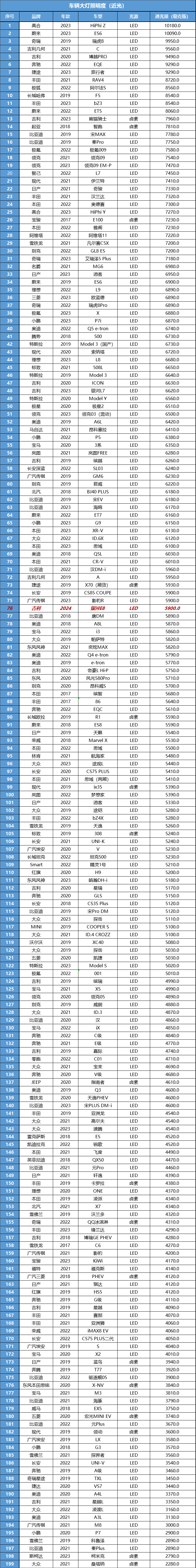 這輛車的大燈是LED光源,最大光照度為5900勒克斯,照明度還可以。
