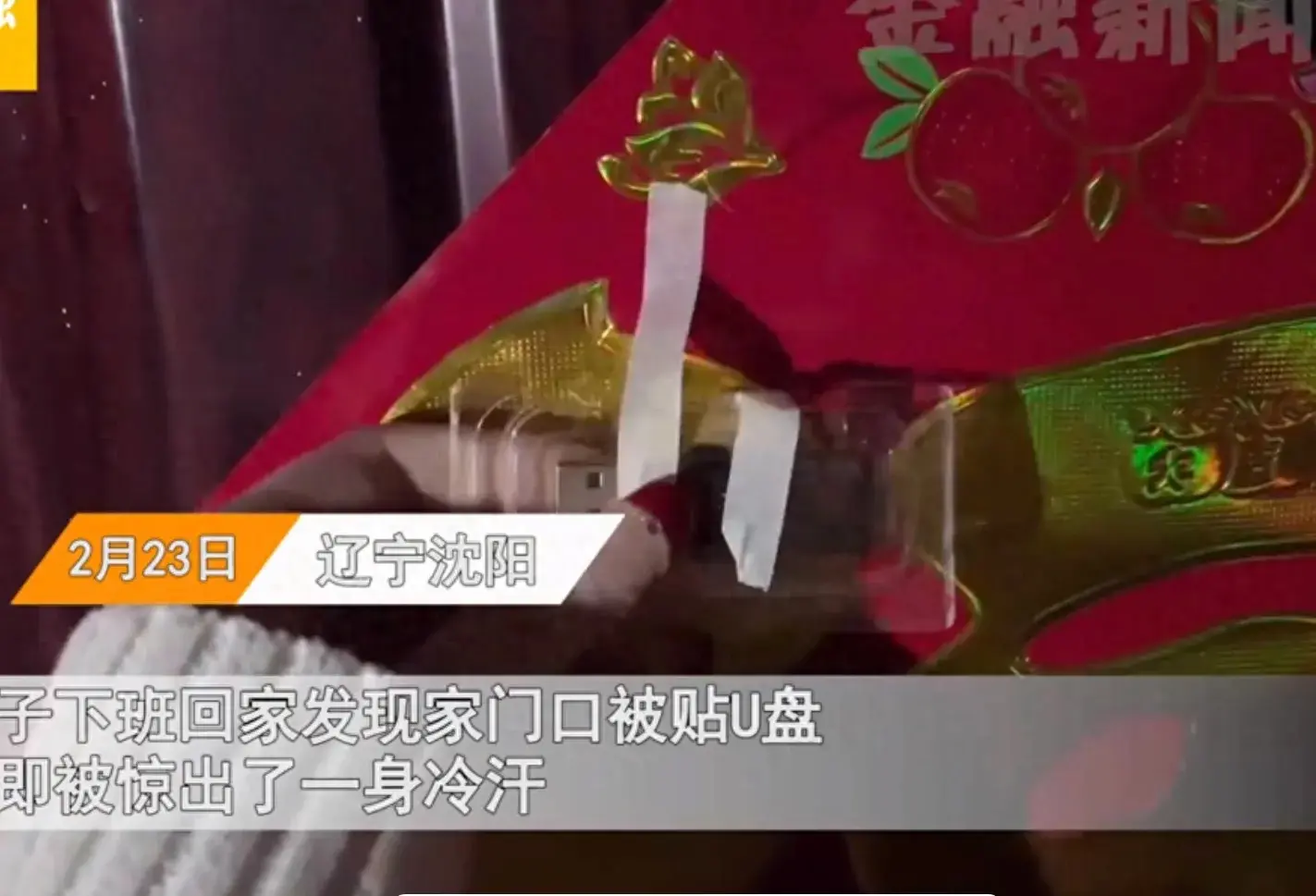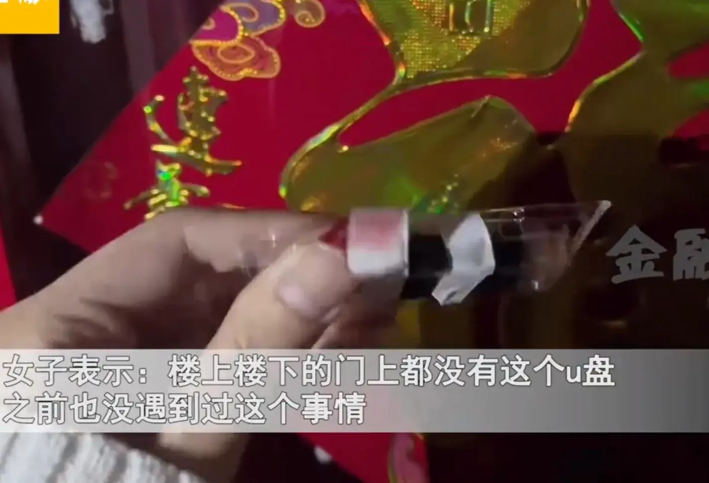 根據女子的描述,自己看到自家房門上竟然被人用膠帶粘了一個U盤!
