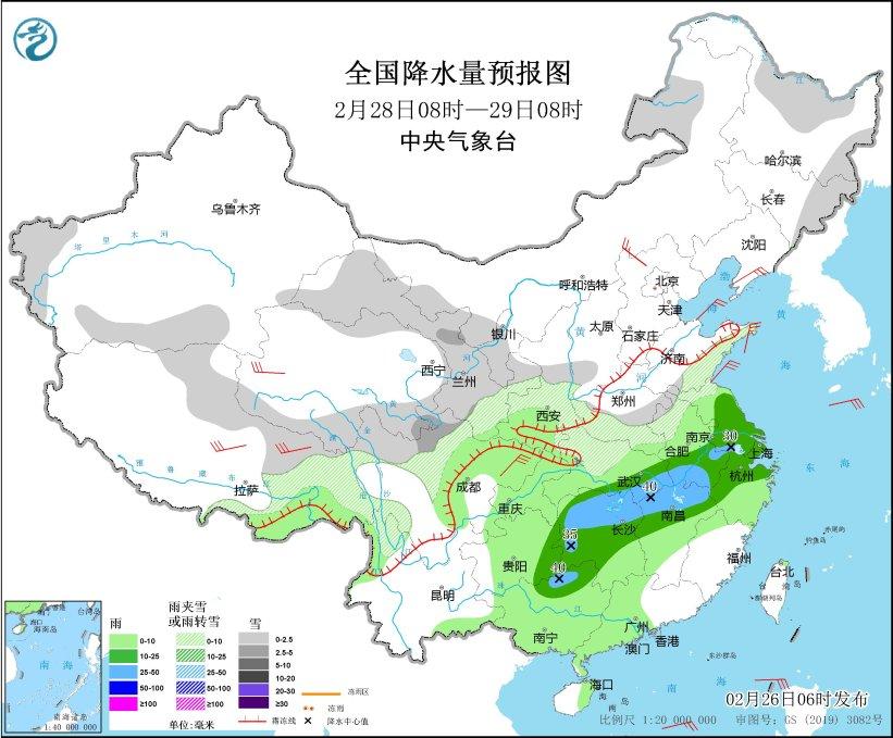 西藏東南部、西南地區東部、江漢、江淮、江南大部、華南西部等地的部分地區有小到中雨,安徽中南部、江蘇南部、湖北東部、湖南中西部和北部、江西北部、廣西東北部等地的部分地區有大雨(25~40毫米)。