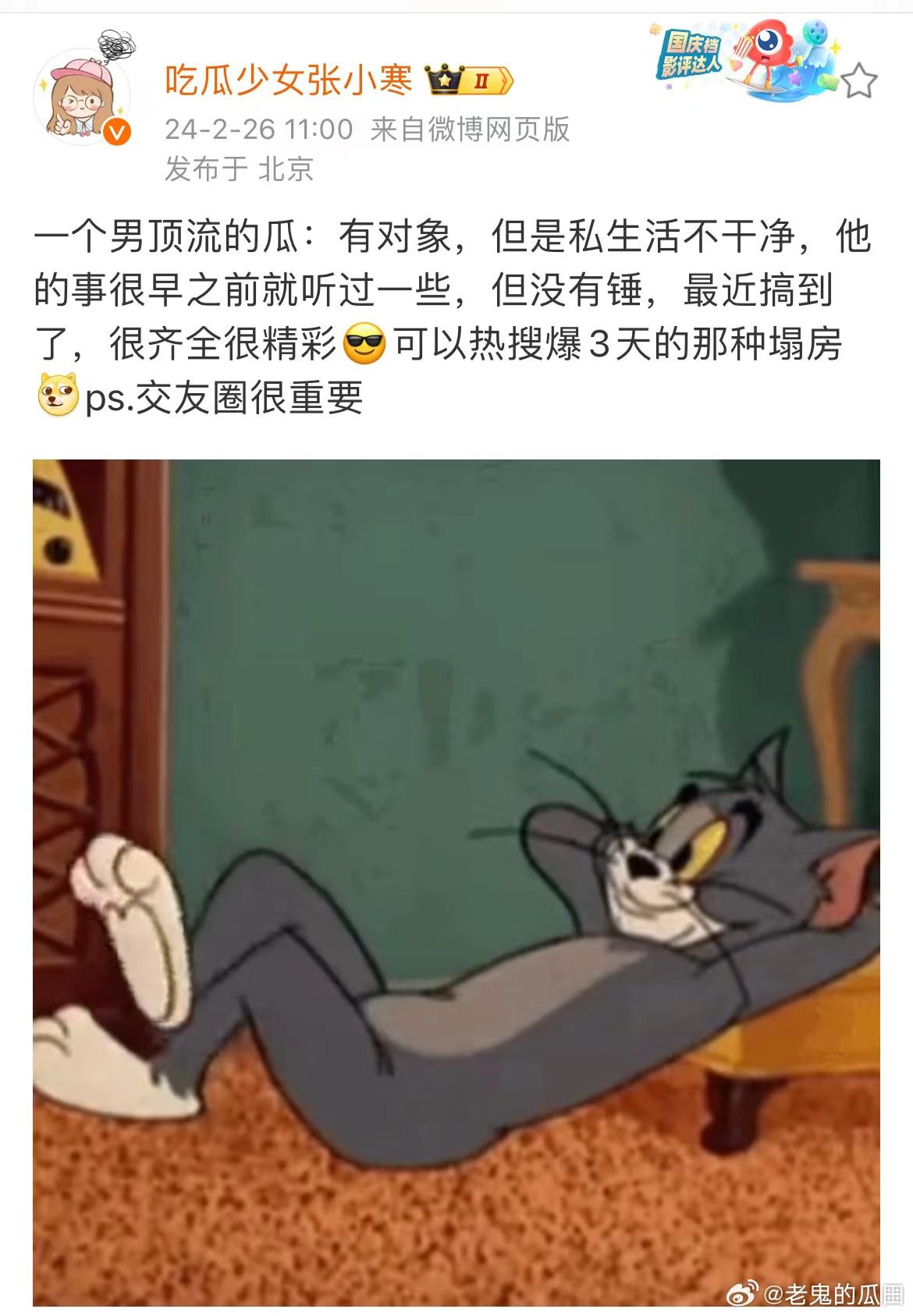 2月24日,狗仔吃瓜少女張小寒在微博發布:一個難頂流的瓜:有對象,但是私生活不干凈,他的事很早之前就聽過一些,但沒有錘,最近搞到了,很齊全很精彩,可以熱搜爆3天的那種塌方。雖然很多網友在吐槽現在的狗仔總是爆假消息,但是也不影響這條微博上熱搜,網友各種猜測,粉絲各種打架。