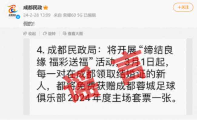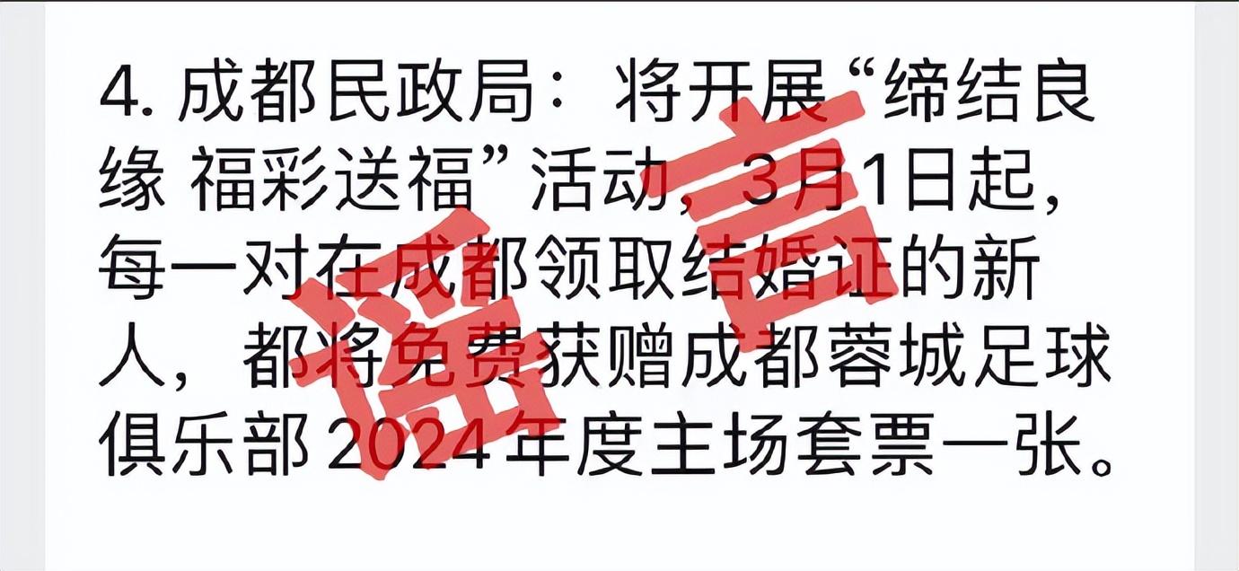 日前,有傳言成都民政局將開展“締結(jié)良緣 福彩送褔”活動,3月1日起,每一對在成都領(lǐng)取結(jié)婚證的新人,都將免費(fèi)獲贈成都蓉城足球俱樂部2024年度主場套票一張。