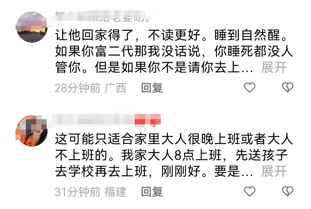上海一家長在家長群里懟老師,大意為:從今天開始,自己孩子所有的第一節早課都不上,要讓他睡到自然醒。孩子的睡眠比早課更重要,自己作為大人都起不來。