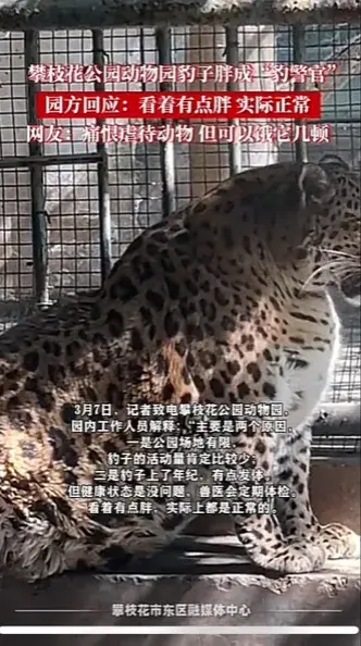 最近,攀枝花公園動物園的一只豹子席卷了熱搜榜!原因是它的胖成球的身材酷似《瘋狂動物城》中的“豹警官”。網友們紛紛調侃:“攀枝花公園動物園沒有虐待動物?。?rdquo;也有關心豹子健康的網友。這個可愛的故事引發了廣泛的關注和討論。