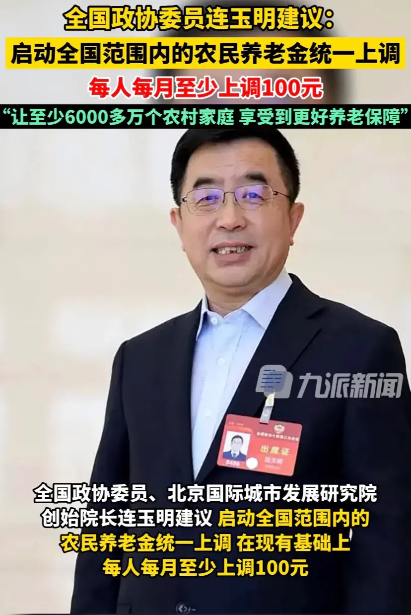 2.連玉明建議:啟動全國范圍內農民養老金統一上調,在現有基礎上,每人每月至少上調100元
