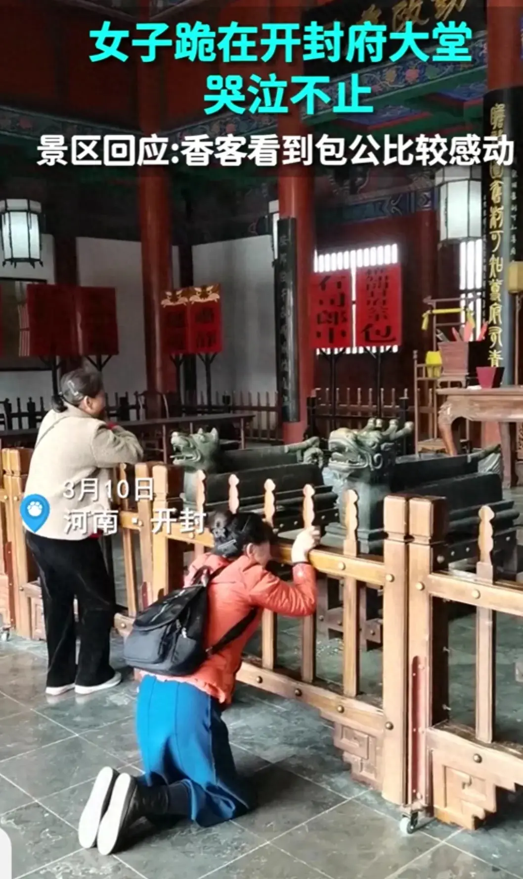 ?近日,河南開封府大堂一幕令人感動的場景,在社交媒體上引發(fā)熱議。一名女子跪在開封府大堂中,淚水不止,讓人心生憐憫。這一幕也引起了眾多游客的關注。經(jīng)過調(diào)查,我們得知,這位女子因為被包公文化深深觸動,不禁流下了眼淚。
