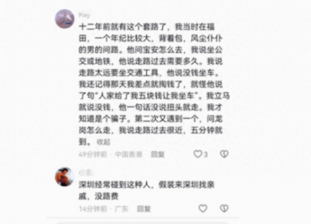 十二年前就有這個套路,我當(dāng)時在福田,一個年紀(jì)比較大,背著包風(fēng)塵仆仆問路。他問寶安怎么去,我說坐公交或地鐵,他說走路過去需要多久。