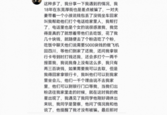 網(wǎng)友小北分享個人遭遇,18年在東莞厚街也是差點(diǎn)被騙了,一對夫妻帶著一個小孩說錢包丟了沒錢坐車回家叫我?guī)椭麄兇騻€電話給家里人,我?guī)痛蛄耍娫捓镆彩莻€女的說很感激我,我覺得是真的了就想著帶他們?nèi)コ燥垼宋規(guī)资畨K錢,就隨便去了個粉店吃了個粉。