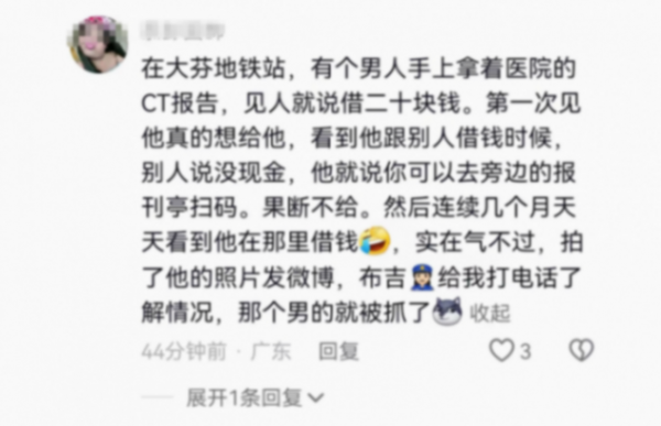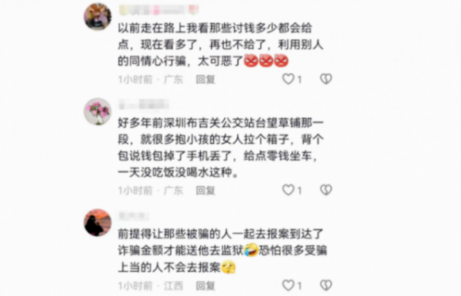 這次被抓男子為王某,他2020年就來深圳,他與親屬一起居住在南山某出租房里面,7年來扮演老人身份,以無錢坐車或吃飯為由博取同情,騙取小額資助,網(wǎng)傳其“行騙二十余年且購買多處房產(chǎn)”消息不實,大家曬出被騙經(jīng)歷,指責(zé)這類人雖然是極少數(shù),但是在社會上影響極壞,導(dǎo)致了社會信任危機(jī)。