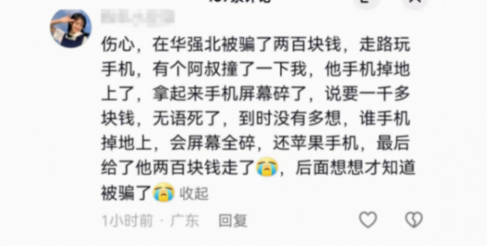 騙子花樣五花八門,還有專門盯著玩手機(jī)的人,通過碰瓷,將手機(jī)掉地上,然后找人索賠,本身即是壞手機(jī),很多時候都會選擇花錢息事寧人。