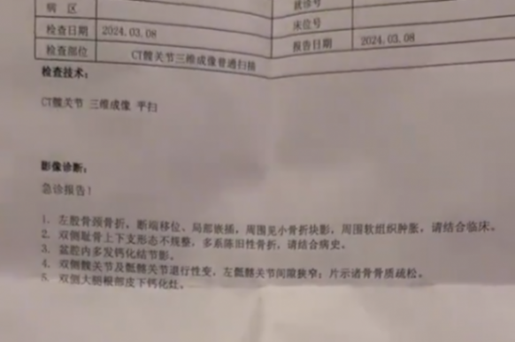 隨后,女子拿出了醫院的診斷報告和CT片,同時稱媽媽被醫院檢查出多處骨折。而酒店方面不打算負責,認為是這是她們自己的原因,如果對此有異議,那么可以選擇起訴。