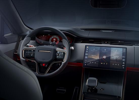 內飾方面,整體布局與現款路虎攬勝運動版差別不大,內飾整體配色以暗色調為主,還采用了碳纖維覆蓋件和金屬材質進行點綴,渲染出濃郁的運動氛圍。方向盤相較于普通版路虎攬勝運動版進行了升級,不僅在中部增加SV專屬標識,還對雙手抓握處進行了加粗處理,更符合人體工程學。方向盤后部采用半透明的換擋撥片,自帶紅色燈光效果。中控臺采用13.1英寸的懸浮曲面屏,引入最新一代Pivi Pro4娛樂系統。