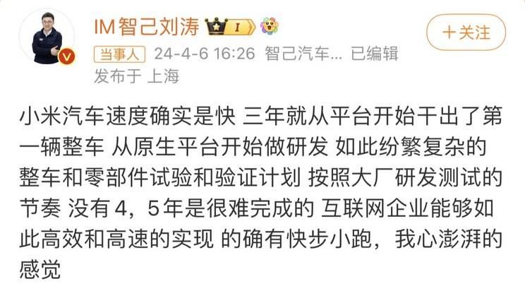 日前,智己汽車CEO聯席劉濤在社交媒體上表示,“小米汽車速度確實是快,三年就從平臺開始干出了第一輛整車,從原生平臺開始做研發,如此紛繁復雜的整車和零部件試驗和驗證計劃,按照大廠研發測試的節奏,沒有4、5年是很難完成的,互聯網企業能夠如此高效和高速的實現,的確有快步小跑,我心澎湃的感覺。”智己汽車作為上汽集團旗下造車新勢力品牌,也就是劉濤所述的傳統大廠。對此,雷軍也做出了回應。