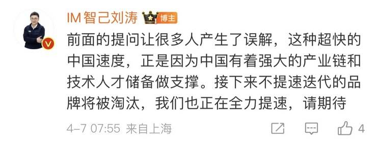 隨后劉濤也在社交媒體上留言表示贊同,稱“超快的中國速度,正是因為中國有強大的產業鏈和技術人才儲備做支撐。接下來不提速迭代的品牌將被淘汰,我們也正在全力提速。”