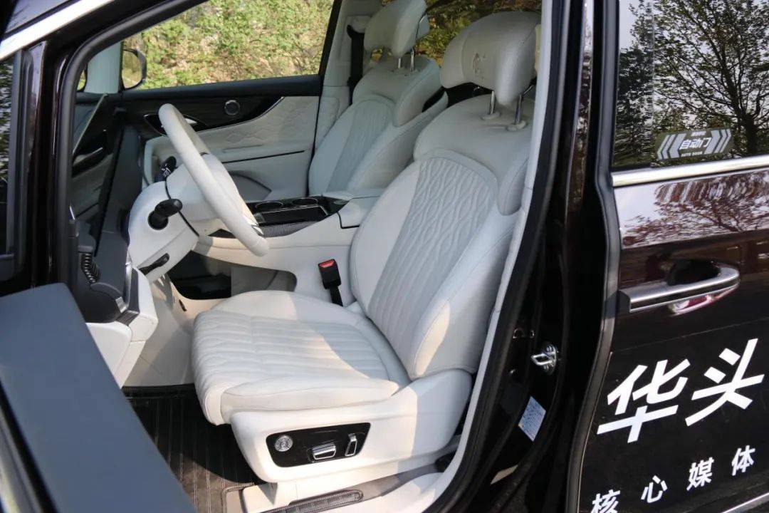 主駕駛的位置為10向可調電動座椅,包含了加熱、通風和8點位按摩功能,并且自帶座椅記憶。副駕座椅則為家庭女主人專門設計,支持8向電動調節,還可通過語音或手機一鍵調節至最舒適的半躺位置,同樣配備加熱、通風和8點位按摩功能,搭配五種預設按摩模式。
