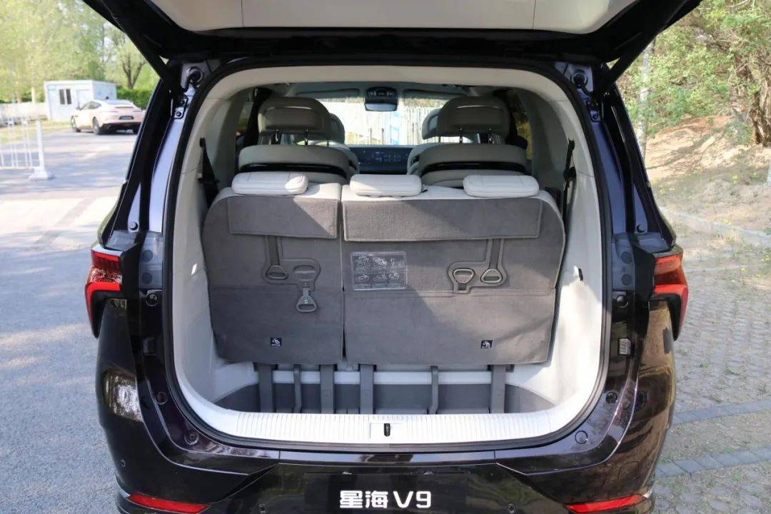 此外,在星海V9的第三排落座,不僅空間不會讓人感到憋屈,較寬的中央通道讓進出第三排也可保持從容。第三排座椅同樣支持靠背角度的調節,同時還可以收納至地板之下,此時的行李廂容積可達1416升,可以容納自行車、燒烤炊具等大號物品。而在2人模式時,第二排座椅移動至最前方位置,便可形成一個將近2800升的超大裝載空間。即便在滿載7人的情況下,下沉式的行李廂也足以容納7個20寸行李箱外加7個背包。