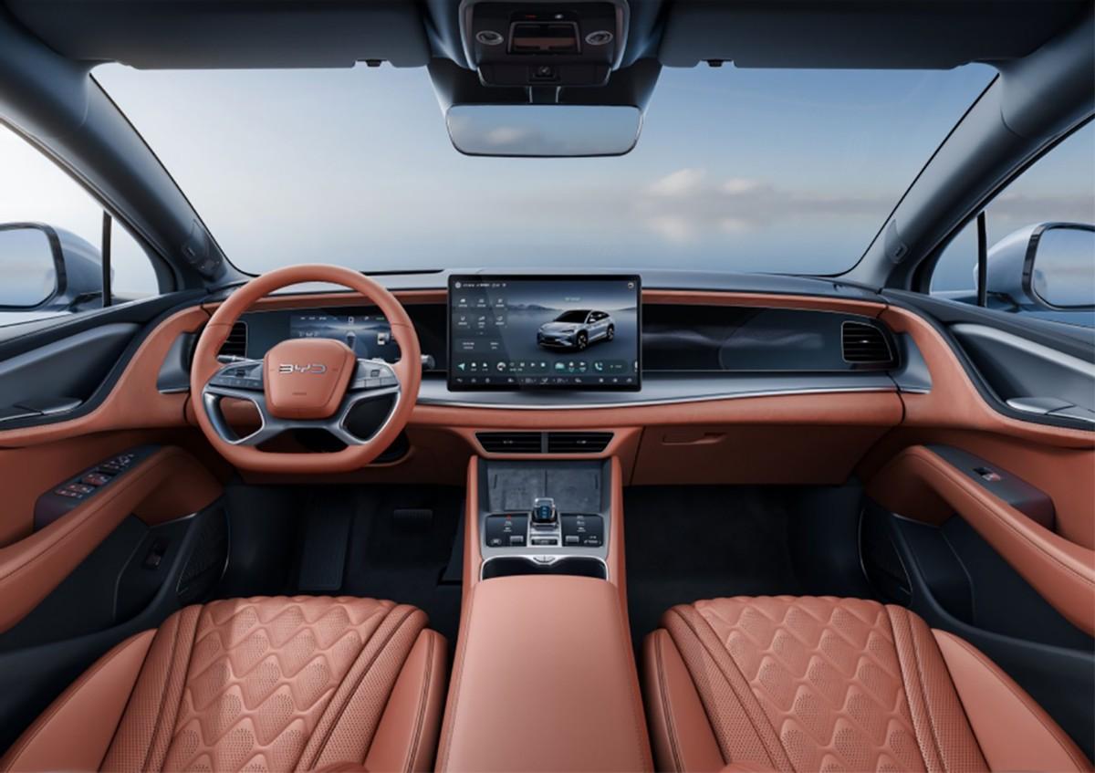 內飾部分,海獅07EV的中控臺更有立體感,全液晶儀表盤嵌入其中,中控屏為懸浮樣式,官圖上的車型采用棕色內飾,看起來挺有好豪華感,就是空調出風口的細節不如宋L來得精致。另外,網友對它的四幅方向盤好像不太適應,有點吐槽。