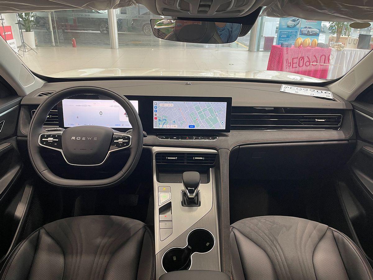 中控臺也和榮威eRX5基本一致,全液晶儀表盤和中控屏組成雙聯屏的形式,尺寸均為12.3英寸,是座艙科技感的主要來源。方向盤樣式有調整,為最新的家族風格,雙幅造型,全系都為皮革材質。空調出風口為一體式設計,還能看到翻毛皮等材質,精致感有所體現。