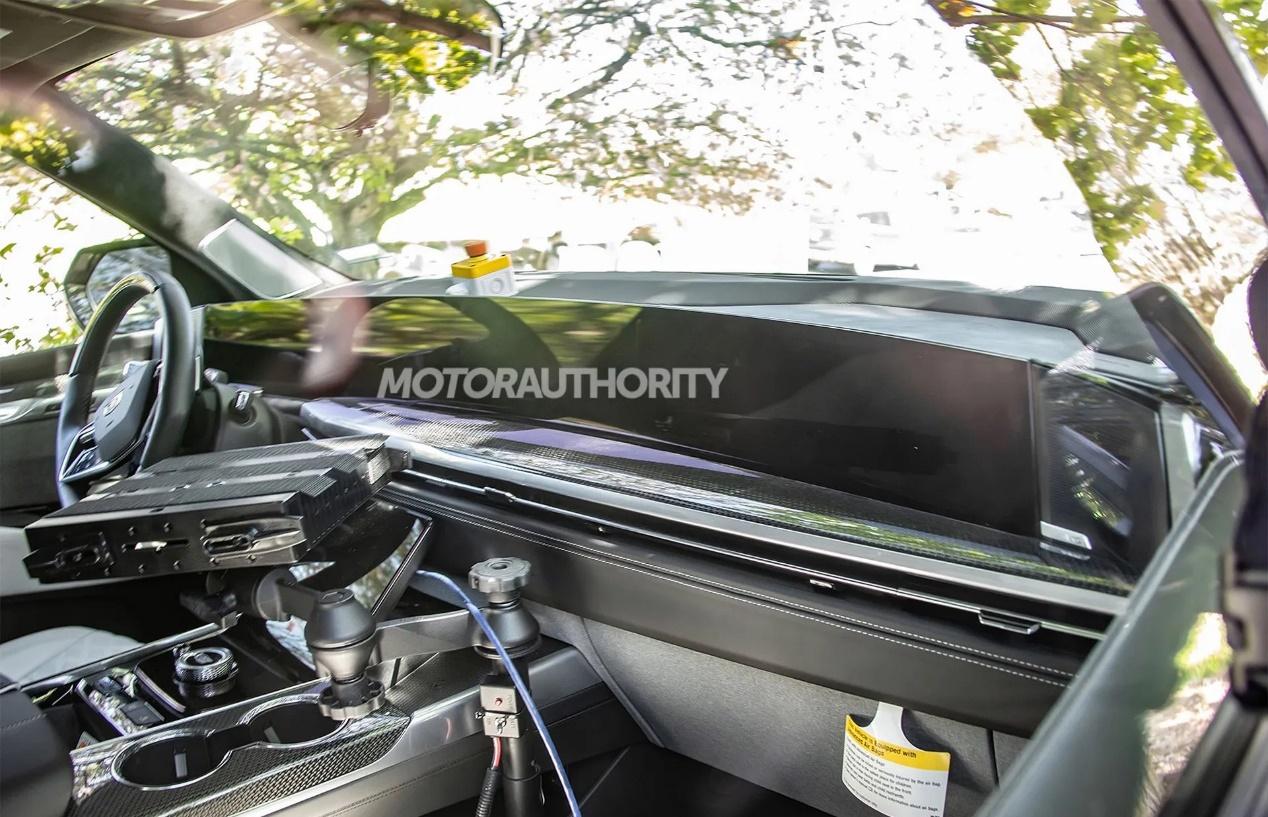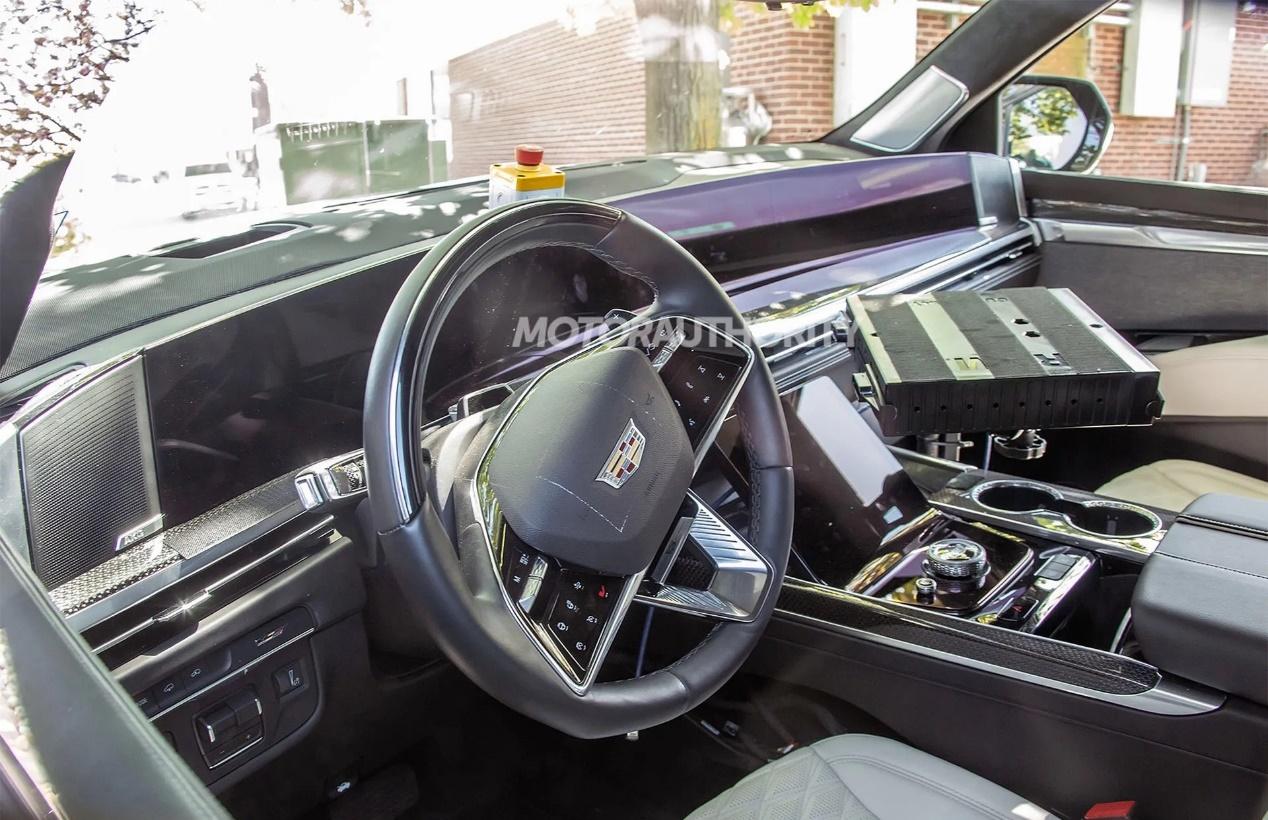 因為是測試車,內飾還沒有完全裝備,有一些測試儀器,不過能看到貫穿式的液晶屏幕、中央通道控制屏等等。這塊中控屏的尺寸或許會達到55英寸,曲面屏,分辨率估計不低。