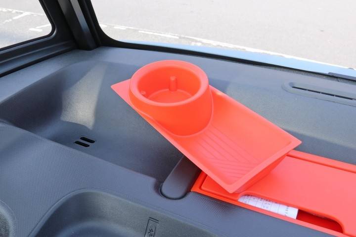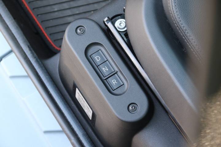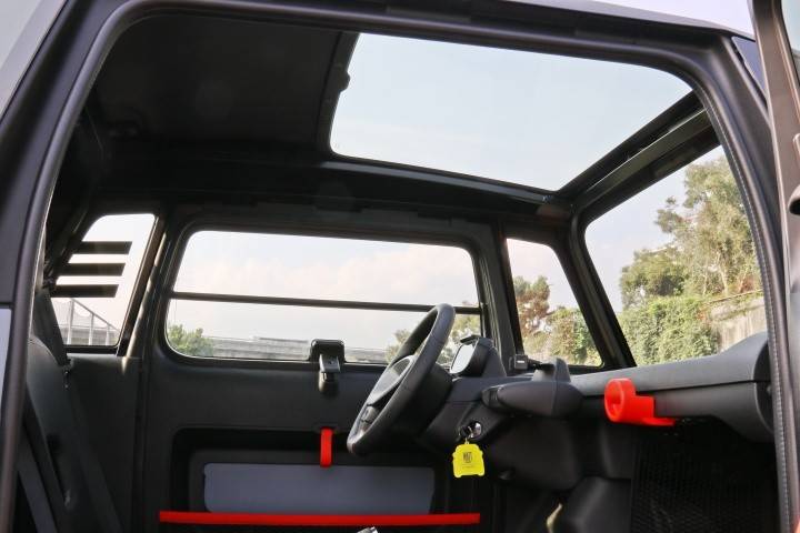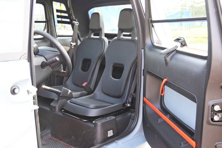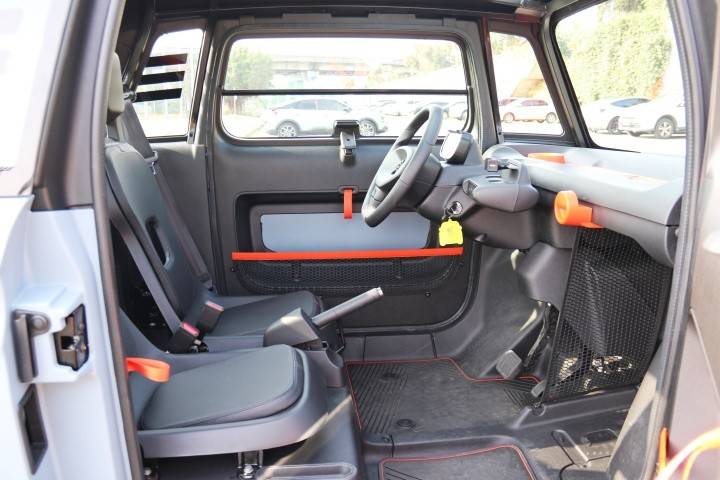 兩張座椅以塑料材質(zhì)打造,僅駕駛座側(cè)提供前后滑移調(diào)整機(jī)能,中控臺布局圍繞「純粹駕駛樂趣」的宗旨,運(yùn)動化平把 3 幅式方向盤上方并無任何多功能按鍵,后方儀表板由單色信息幕組成,內(nèi)容囊括時速、檔位、剩余電量、可行駛里程、總里程及警示燈號等信息,在「4 輪機(jī)車」的基礎(chǔ)下,并沒有配置冷氣空調(diào)及多媒體影音系統(tǒng),僅提供手機(jī)支架、暖風(fēng)前擋除霧、鼓風(fēng)機(jī)的配置,雙前座椅中央并無中央扶手,僅保留傳統(tǒng)手剎車,至于換檔方式,則移至駕駛座左側(cè),透過按鈕方式切換 D 檔、N 檔及 R 檔。