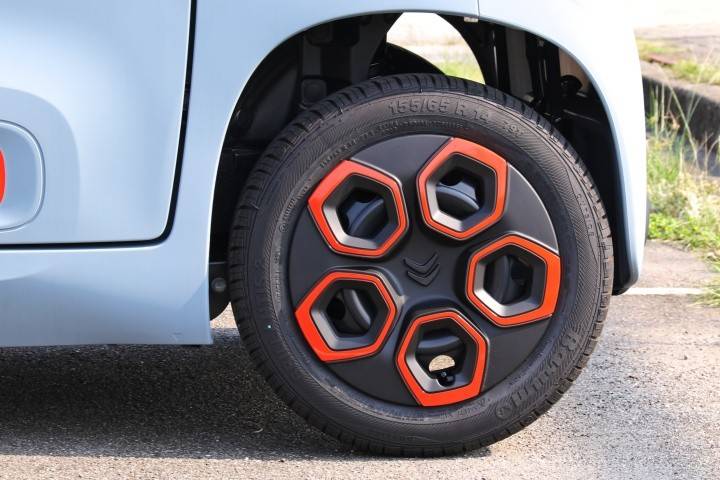全車燈具均采 LED 光源,在車身兩側(cè)可以看到延續(xù)品牌 Air Bump 防碰撞防護(hù)設(shè)計的造型設(shè)計,本次試駕體驗的車款為較高階的 Ami Pop 車型,因此在車門、門把及輪圈飾蓋上,均可以看到橘色元素的點(diǎn)綴,配胎規(guī)格為 155/65 R14。值得關(guān)注的是,雪鐵龍 Ami 在原廠「4 輪機(jī)車」的定義下,車體結(jié)構(gòu)以鋼管、塑鋼殼材料組成,并非傳統(tǒng)鋼材打造車體,不過在車頂仍保留品牌具代表性的全景式玻璃天窗設(shè)計。