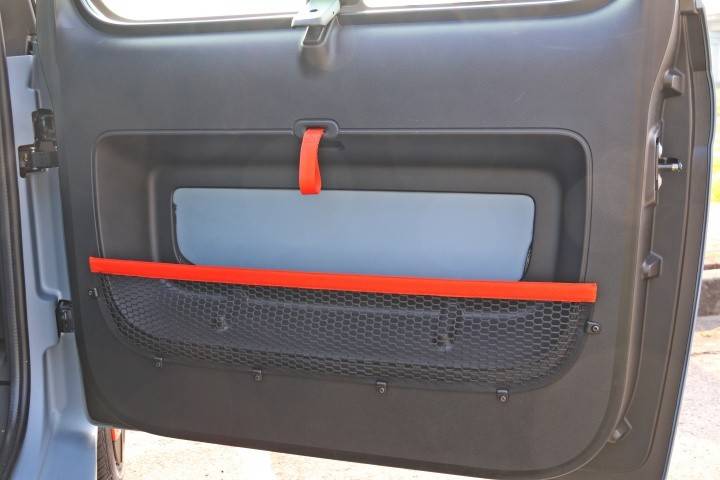 雪鐵龍 Ami 門板下方規(guī)劃的置物彈性網(wǎng),同時也使用橘色的跳色巧思。