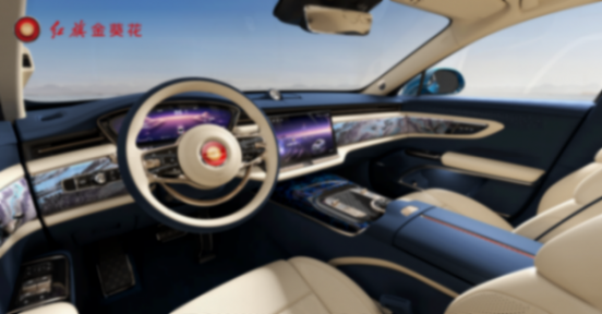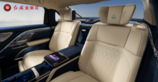 內飾采用呼應外觀的米白色+藍色雙拼色設計,中控臺面以及門板處加入特殊的彩繪圖案,以此來彰顯高級感,前擋風下方配備了懸浮時鐘,再加上帶有金葵花標識的雙色方向盤、扶手箱區域的中軸線,再度強化了尊貴感。四座版本的中央扶手貫穿前后排,提供兩塊后排娛樂屏以及扶手箱觸控屏。