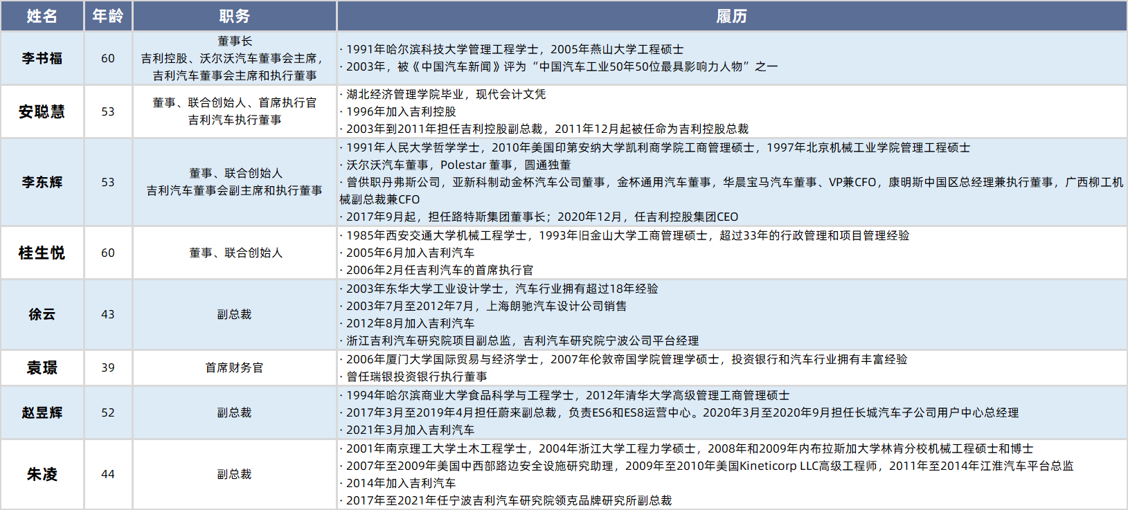 李東輝擔任極氪董事,目前還是吉利汽車的董事會副主席和執(zhí)行董事,吉利控股集團的執(zhí)行副總裁和首席財務官。他是人大哲學系畢業(yè),隨后獲得北京信息科技大學管理工程專業(yè)碩士學位,美國印第安納大學凱利商學院MBA學位。曾擔任華晨寶馬董事,美國康明斯發(fā)電機事業(yè)部中國區(qū)總經(jīng)理兼執(zhí)行董事等職務,2017年9月起,擔任路特斯集團董事長,隨后在吉利公司擔任重要職務。在企業(yè)管理、戰(zhàn)略規(guī)劃、投資、財務管理以及跨境并購和合作方面經(jīng)驗豐富。