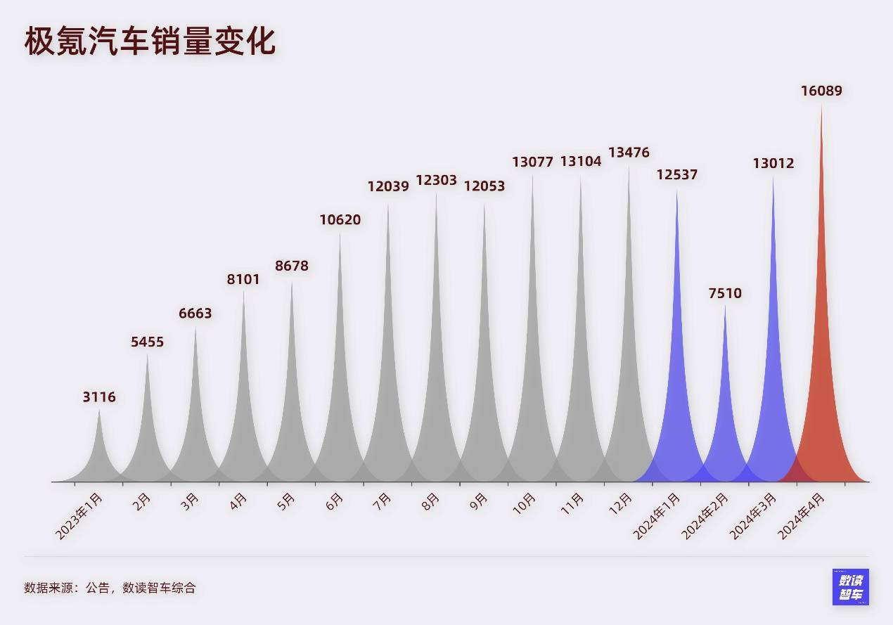 去年四季度,在小鵬月銷突破2萬臺,蔚來突破1.8萬臺的大背景下,極氪的月銷始終沒有突破1.5萬臺,直到今年4月,極氪終于突破了這個天花板。這可能也與極氪缺少互聯(lián)網(wǎng)營銷基因有關,雖然性價比高、產(chǎn)品體驗和創(chuàng)新性強,但極氪相比于蔚小理以及問界、小米,在市場關注度上有明顯差距。