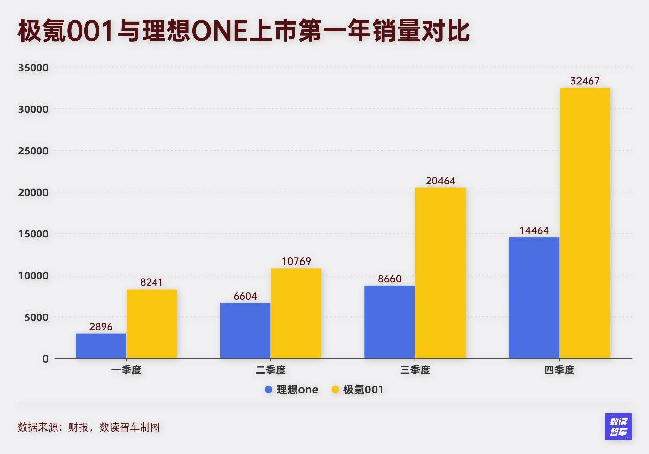 產(chǎn)品表現(xiàn)也反映了性價比高的現(xiàn)實。從2022年到2023年,極氪汽車的銷量從71941臺增加到118685臺,2023年平均月銷幾乎過萬,發(fā)展態(tài)勢積極、增長非常明顯。最早推出的極氪001可以說是大單品,在推出之初,001甚至一度“訂斷貨”,被質疑為饑餓營銷。簡單對比理想ONE第一年的數(shù)據(jù),極氪001的表現(xiàn)非但不差,甚至可以說是全面超越。