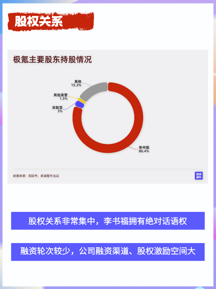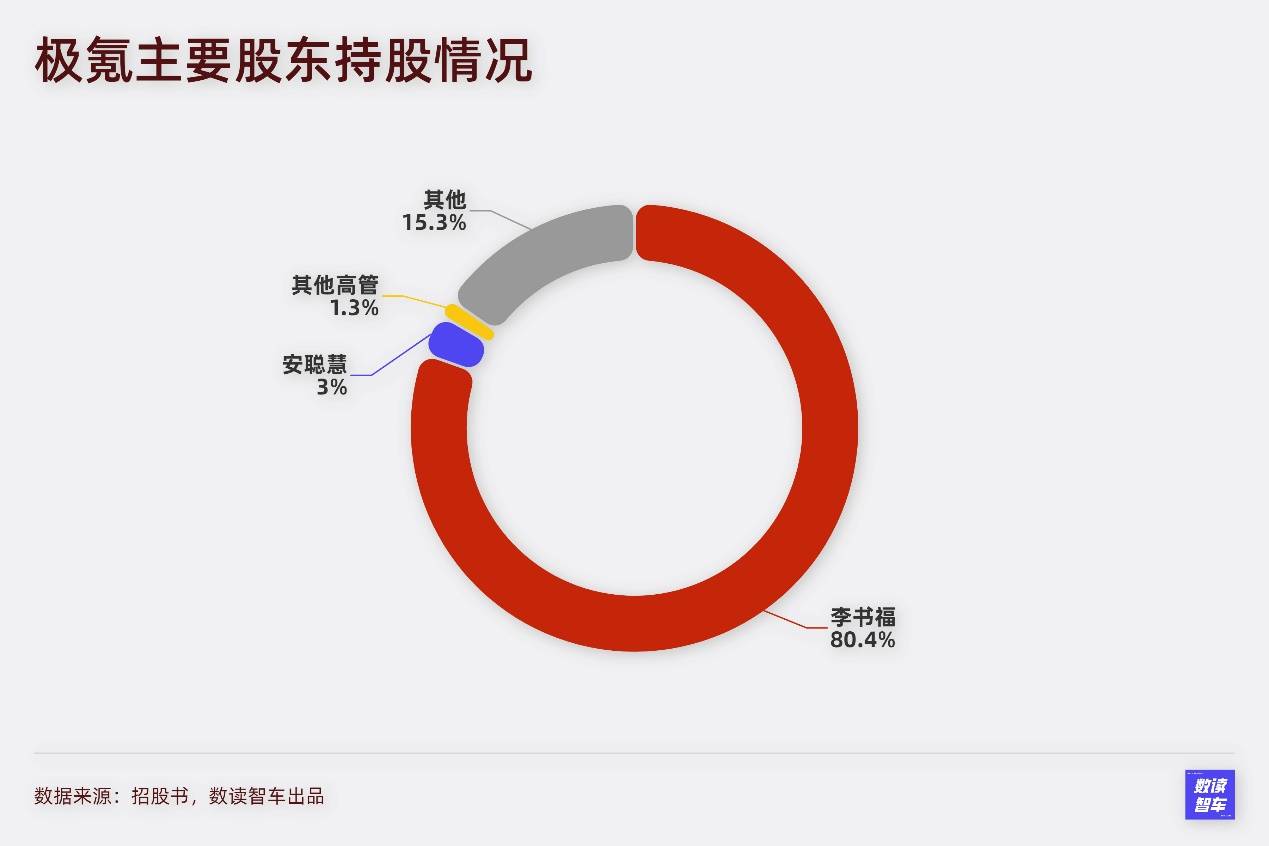 由于極氪只有兩輪融資,因此股權極度集中,李書福個人持股80.4%,管理團隊擁有絕對控股權。