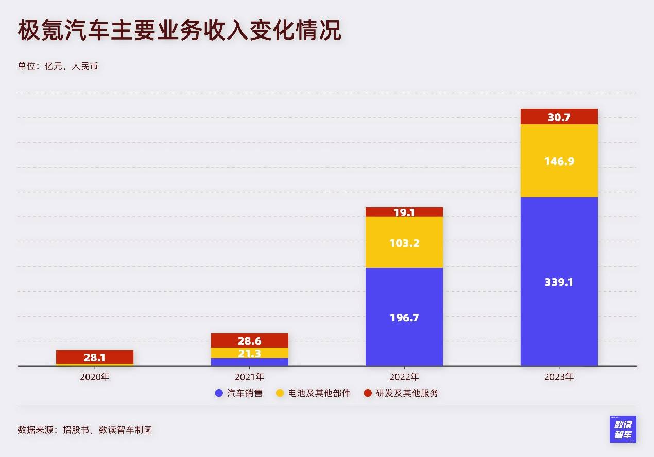 不過,極氪的營收構成相對特別,與比亞迪、特斯拉的模式較為相似,并不是只依賴車輛銷售,還有電池及其他部件和研發(fā)及其他服務亮相收入,分別由旗下子公司寧波威睿和中歐汽車技術中心提供,三項業(yè)務分別占比6.5、3、0.5。電池及部件隨著車輛銷售的增加而增長,是非線性的,研發(fā)相關業(yè)務增長比較平緩。