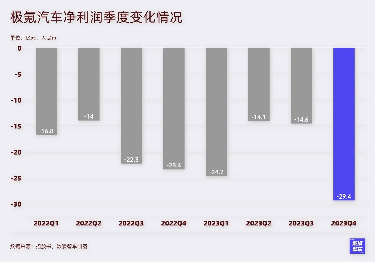 極氪的虧損也在持續(xù),2023年虧損82.64億元,同比擴大8%。按照季度看,極氪在去年四季度虧損再次擴大,創(chuàng)造了單季度的虧損新高。在普遍降價促銷的當下,極氪也面臨著不小的虧損壓力。