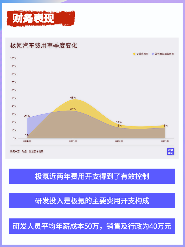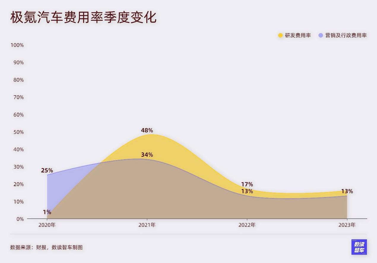 經(jīng)過了兩年的發(fā)展,極氪的成本開支進行了有效的控制。2023年,銷售成本增速為52%,增速低于營收增速。研發(fā)費用是開支的主力,費用率最近兩年穩(wěn)定在16-17%;銷售費用率降至13%。