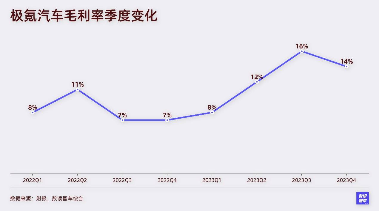 極氪的營收與銷量呈現(xiàn)正相關,由于銷量增長,極氪的營收也快速增長。2022年,從0到1的階段,極氪001的亮眼表現(xiàn)推動了營收大增3.9倍。2023年,從1到10的階段,銷量有所增長,但增速并不明顯,因此營收增速降至62%。