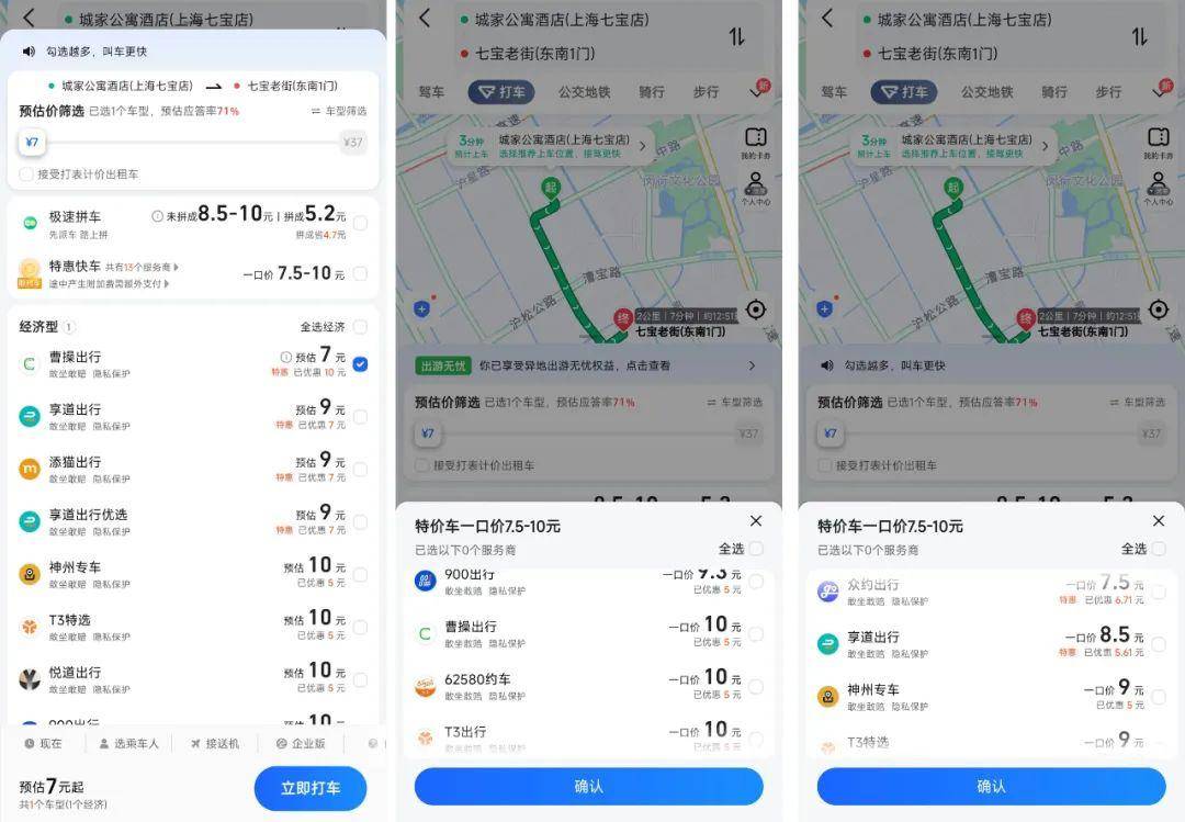 在高德、美團等打車軟件中可看到,曹操出行已加入特價車推薦,但也有3家-8家網約車公司同時在列,競爭不小。