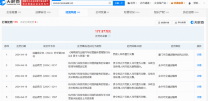 據天眼查顯示,曹操出行依托的杭州優行科技有限公司2024年接到行政處罰達47次,自2020年至今累計行政處罰175次,罰金約177.87萬元;其中很多處罰是因為司機或車輛沒有取得相關運營資質。