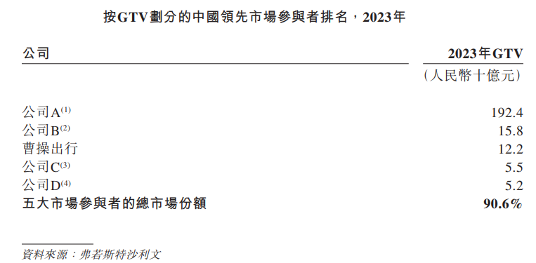 據弗若斯特沙利文數據,按GTV計算,2023年網約車市場90.6%的份額由5家網約車平臺公司占據,其中排名第一的公司占據了75.5%的市場份額。